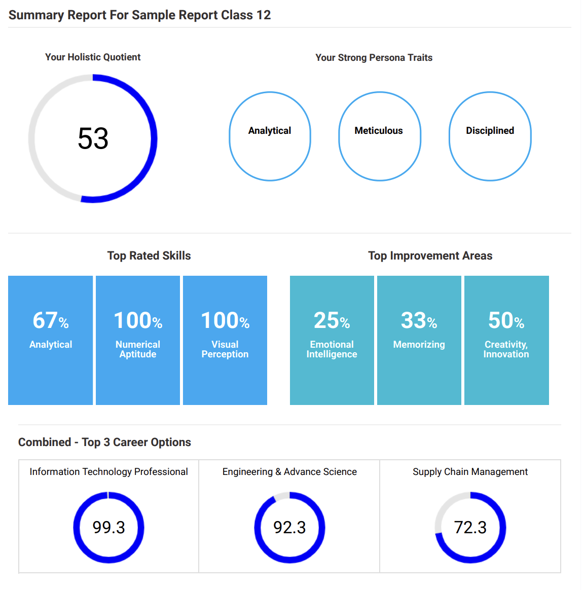 The test was like an aptitude test but the feedback from that single test was very detailed . It really got my key areas where I'm good at and also the areas where I really need improvement. There were career options or choices for me that aligned with my skill thats what I liked. I highly recommend this test and know what your strength and weaknesses are or just to more clear about your career.
